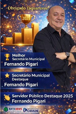 Entre os Destaques do Ano, o Secretário de Administração Geral da Prefeitura Municipal de Taquarussu, Fernando Pigari, foi avaliado como Melhor Secretário, Secretário Destaque e Servidor Público Destaque referente ao ano 2025.