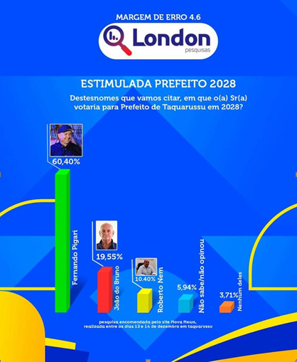 Pigari vem se destacando no cenário político do município, em uma pesquisa realizada através da London Pesquisas, Fernando Pigari foi apontado como favorito na sucessão municipal na eleição de 2028 para prefeito.